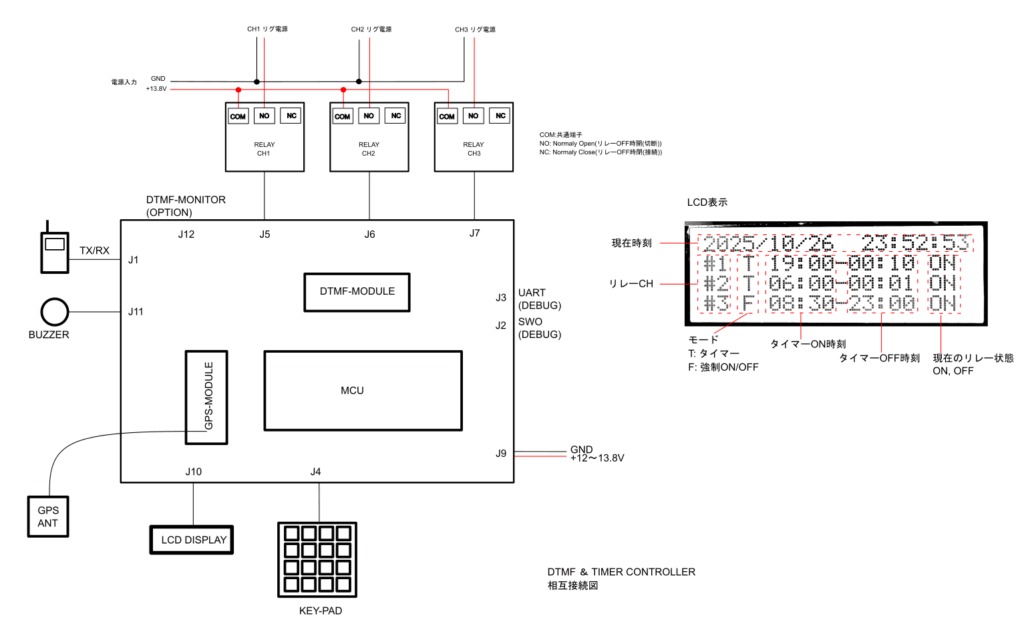 16キーボード、LCD、リレー、DTMF受信機等との接続は以下のとおりです。