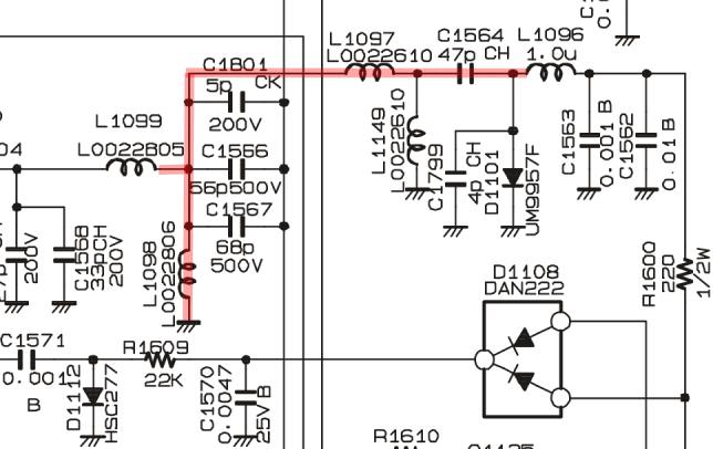 焦げていたのは赤のラインでした。144MHz帯が出力されないのは、L1099へつながるパターンが切れているからでした。