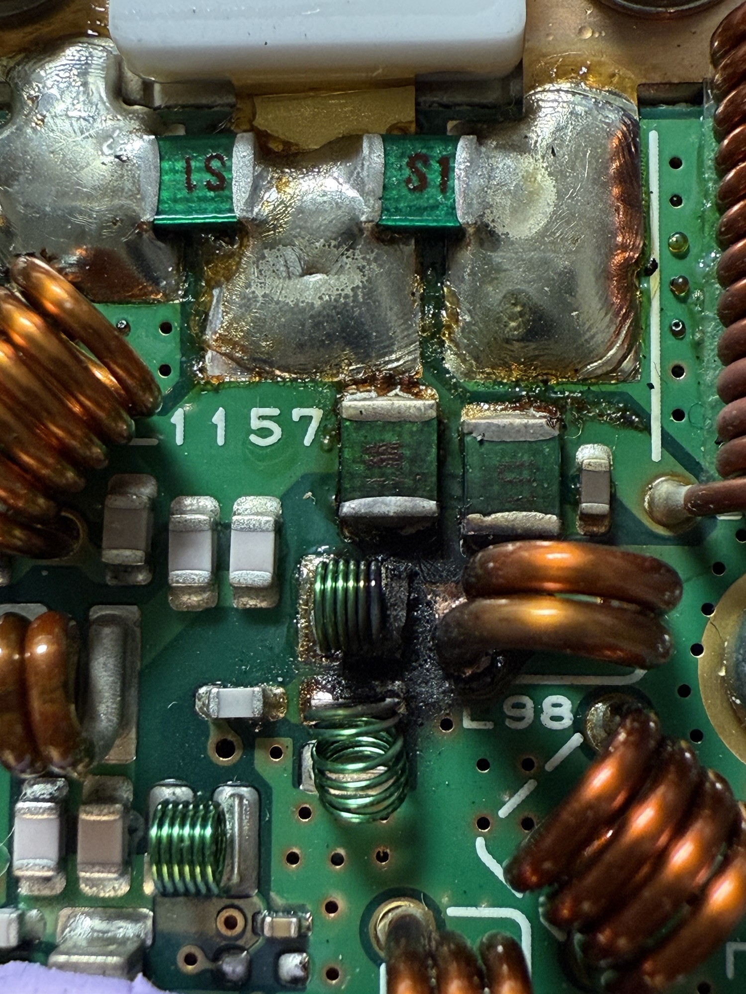 パターンを修復し、焦げたコイルも交換して送信テストすると、出力は定格50Wに対し35~40Wは出るようになりました。まぁ、古い機械だしこんなものかもしれないなと考えていましたが、PTTをおした瞬間にちょっと異臭がするような気がします。最初だけでその後は大丈夫のようなのですが気になります。照明を暗くして、PTT ON/OFFを繰り返すと、PTT ONの時にピカっと光るものが見えます。今度はC1564の所でリークしているようです。しかも、基板内側…炭化した箇所が取り切れずに残っていたのでしょう。何度もPTTを押して確認すると、だんだんとひどくなってきているような気がします。もう一度、コイルとC1564も外し炭化箇所を掃除です。
