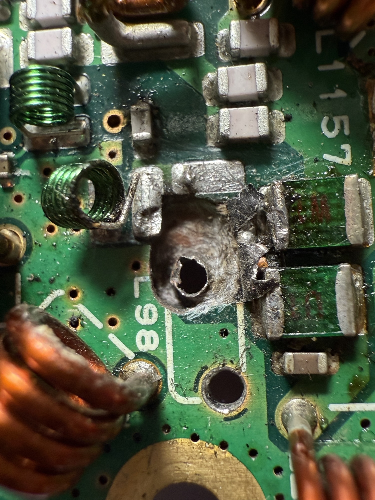 炭化してしまうと、そこからだんだんと被害が拡大します。そのうち、パターンが断線して144MHzの出力が出なくなったのではないかと思います。今回は、(運よく?)先にパターンが切れたので被害が拡大しなかったのではないかと思います。最悪は発煙(したのかもしれない💦)し、ファイナルが飛んでしまっていたかも知れません。ネットでFT-8900の修理を調べてみましたが、今回のようなケースは見つけられませんでした。まぁ、直って良かったです。