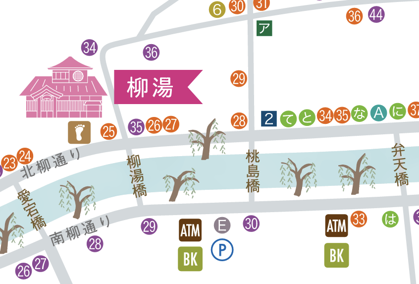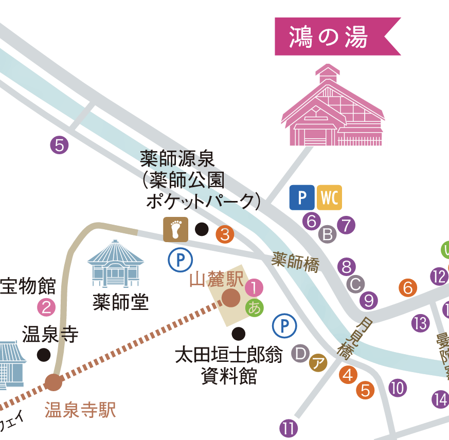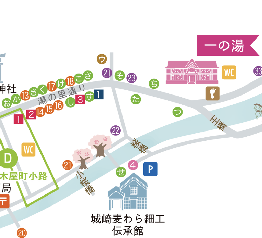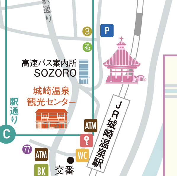 場所の説明に きのさき温泉環境協会公式サイト で配布されているマップを使用させていただきます。