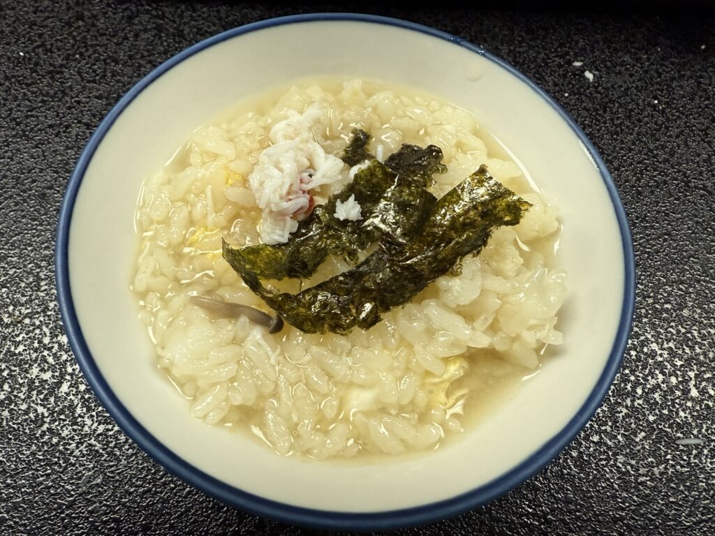 夕食は当然「蟹づくし」です。お目当ての焼き蟹が最高、そして見かけは良くないけど、うまく出汁がとれた雑炊!きれいな温泉宿の料理よりも、こちらの方が断然好みです!